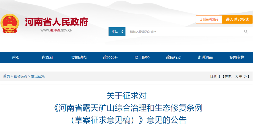 近日,河南省人民政府、河南省司法廳就《河南省露天礦山綜合治理和生態修復條例(草案征求意見稿)》(以下簡稱《條例》)向有關單位和各界人士征求意見。